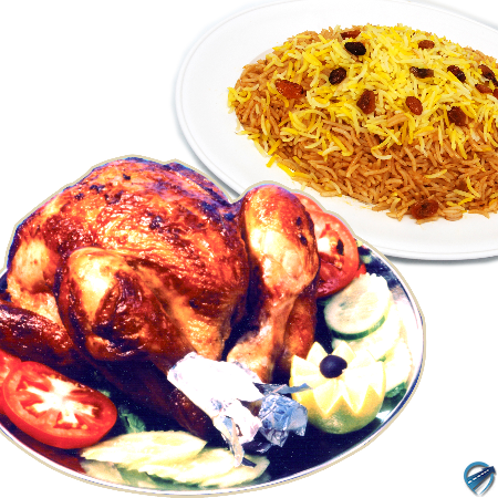 دجاج شواية مع أرز سادة ، طازج وشهي ولذيذ